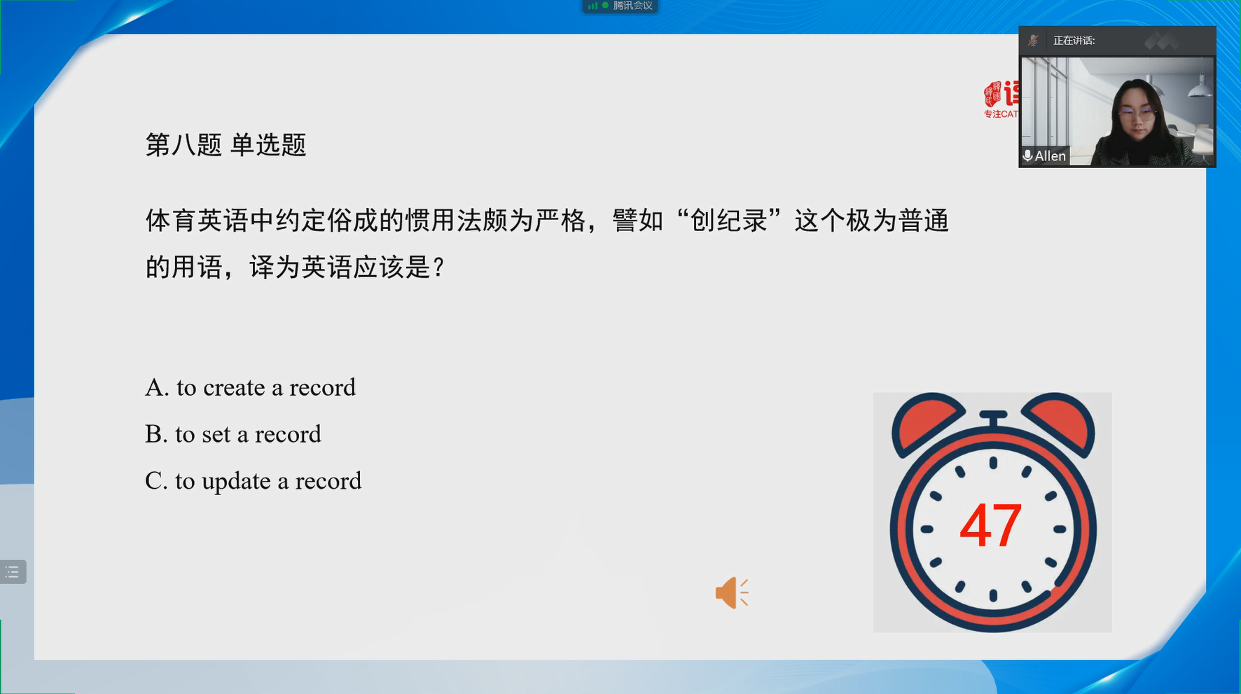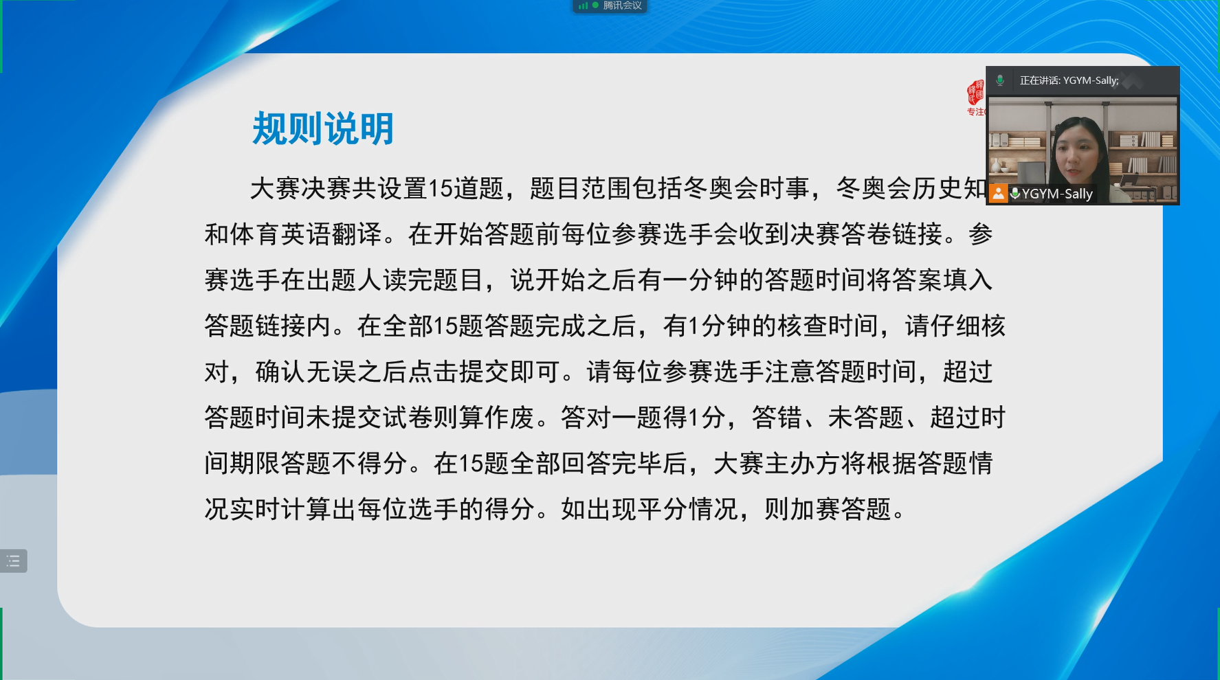 首届SPORT杯全国体育英语翻译知识竞赛自报名以来受到了广泛关注和各大院校老师、同学们的支持,共计有9000余名选手报名参赛。经过预选赛和半决赛两轮的角逐,周莹同学成功进入到总决赛。决赛共有42名同学同场竞技,通过现场答题的形式决出胜负。在经过激烈角逐后,周莹同学取得了优秀的成绩。