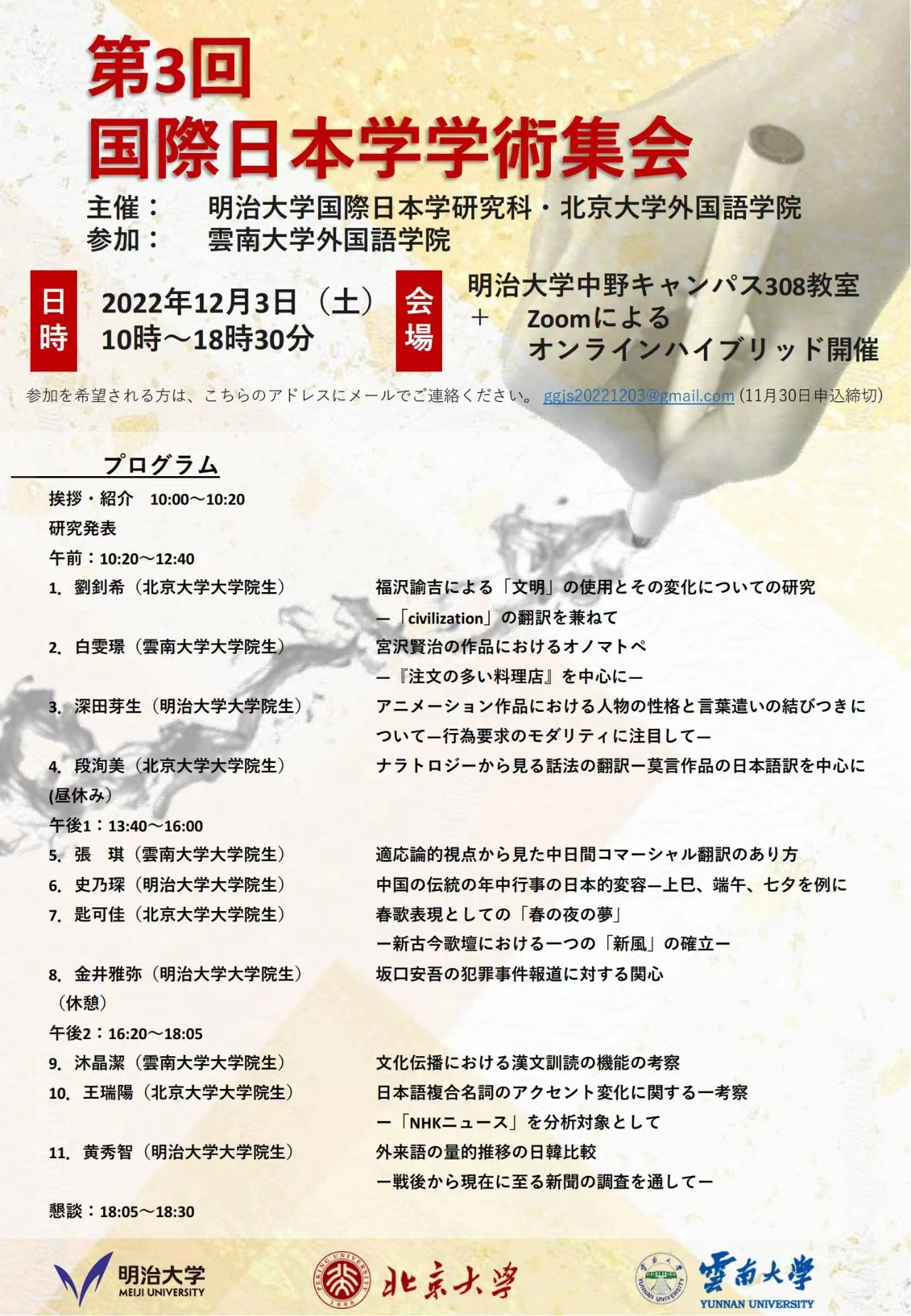 12月3日,由北京大学外国语学院日本语言文化系与日本明治大学国际日本学研究科联合举办的“第三届国际日本学学术集会”以线上线下相结合的方式圆满举行,开云官方网页版院副院长臧运发教授和日语系师生应邀通过线上形式全程参与。该学术论坛此前已成功举办两届,2023年年将由北京大学、明治大学、云南大学三方共同举办。